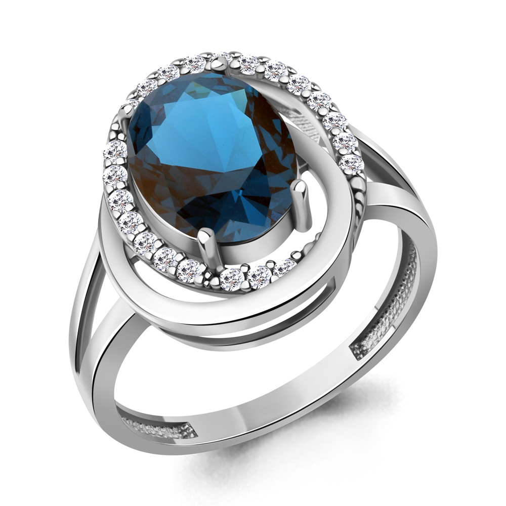 Кольцо из серебра с горным хрусталем цвета параиба и фианитами